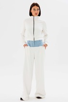 Рубашка с коротким рукавом в стиле оверсайз имеет спущенное плечо, воротник-стойку и изящный V-вырез. Разрезы по бокам придают ей воздушность и динамичность. Широкие длинные штаны на резинке с боковыми разрезами подчеркивают расслабленный и в то же время элегантный образ, выполняя роль неотъемлемой части этого ансамбля.