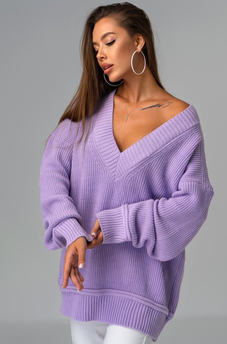 Женский джемпер в сиреневом цвете станет идеальным выбором для создания классного образа. Оверсайз фасон и V-образный вырез добавят легкости и элегантности, а длинный рукав гарантирует комфорт в прохладную погоду.