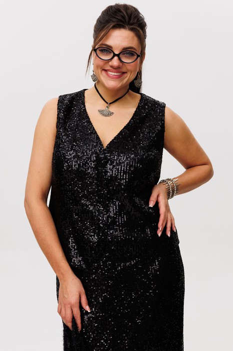 Спереди жилет украшен блестящими пайетками, которые придают образу эффектное сияние, а атласная спинка добавляет мягкость и утончённость. V-образный вырез и аккуратный хлястик на спинке делают модель особенно стильной, подчеркивая её продуманный крой. Застежка на замок завершает образ, сохраняя лаконичность и удобство.