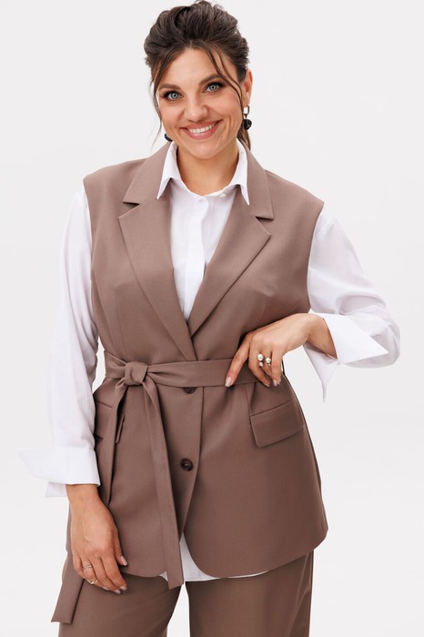 На модели в жилете цвета «кора дуба» брюки 1702, рубашка 1203.1 и топ 767. Также можно купить жилет и брюки в костюме 1501.