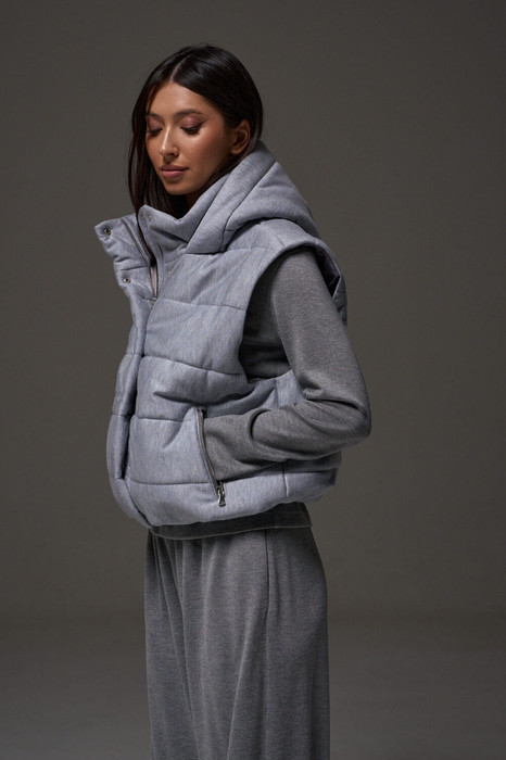 Жилет укороченный, выполнен из стеганной трикотажной ткани серого цвета. Характеристика: жилет А-силуэта, вортник стойка, капюшон цельный с жилетом, центральная застежка на молнию, скрывается под планкой на кнопках, боковые карманы на молнии, по низу изделия резинка с фиксаторами, брендированный подклад, спинка цельнокройная. Длина изделия от края горловины по спинке 58см.