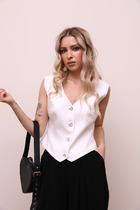 Жилетка женская утепленная с центральной застежкой на "молнию". Спинка со стяжкой. Перед с отрезными бочками и боковыми карманами "с листочкой". Воротник стойка с кулисой и шнуром из декорированной тесьмы. Низ жилетки округлой формы спереди короче, а спинка длиннее . Правый карман украшен нашивкой.