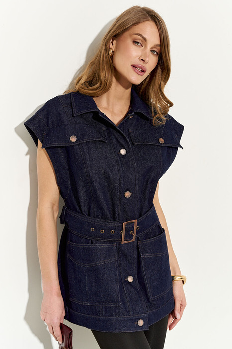 Стильный женский жилет свободного кроя выполнен из натурального хлопкового джинса без подкладки; по переду клапаны-обманки и прорезные функциональные карманы; воротник рубашечный; линия плеча немного спущена; застежка на петли и пуговицы. По спинке хлястики, которыми можно регулировать объем жилета. В комплекте сьемный пояс из основной ткани. Жилет полностью соответсвует заявленному размеру. Пожалуйста, пользуйтесь таблицей замеров готового изделия, чтобы подобрать идеальный размер.