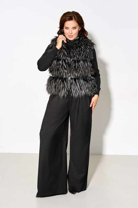 Жилет женский на стеганной утепленной подкладке полуприлегающего силуэта выполнен из искусственного меха с длинным ворсом. По переду, спинке и боковым швам изделия втачные горизонтальные вставки из ЭКО-кожи, воротник-стойка, застежка на кнопки.