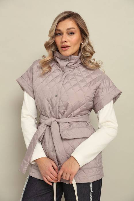 Жилет свободного силуэта из объемной стеганой ткани. Жилет на подкладке. Спущенная линия плеча, застёжка на кнопки. По переду широкие накладные карманы с клапаном с боковым входом для удобства. В комплекте идёт пояс из основной ткани. Длина по спинке 71-73 см.