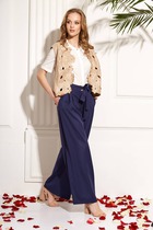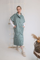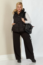 Жилет полуприлегающего силуэта на подкладке. По переду вытачка, переходящая в подрез, функциональный карман. Застежка на петли-пуговицы. По спинке вытачки и хлястик.