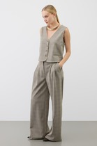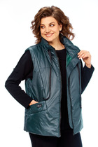 Жилетка полуприлегающего силуэта, длиной чуть выше линии бедер. Жилетка отрезная по линии талии. Лиф спинки и переда с рельефами от пройм до талии. Баска с фигурными подрезами, по переду обработаны карманы. По талии вставлена кулиса, в которую протянута резинка с фиксаторами. По горловине объемная стойка. Линия плеча спущена. по переду застёжка на декоративную тесьму-«молнию». Жилетка на подкладке и утеплена синтепоном.