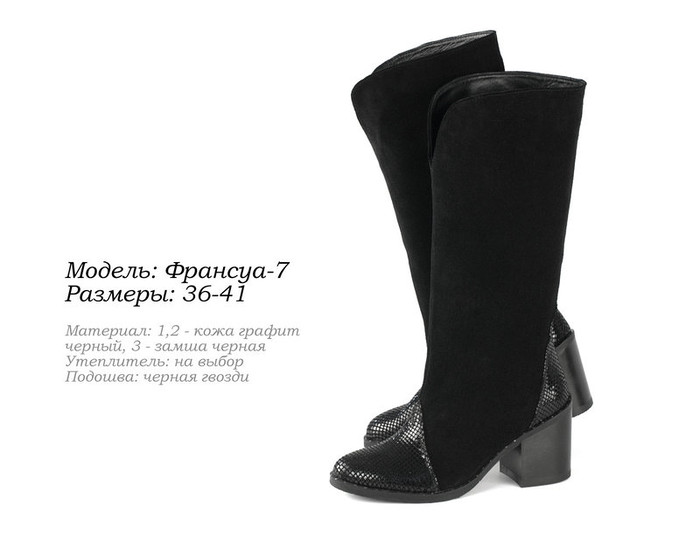 Сапоги изготавливаем в любых цветах из обширного каталога наших материалов. Образцы материалов представлены на сайте в альбоме "Виды кожи и замши в наличии" http://soldi.org.ua/g1553513-vidy-kozhi-zamsh цена 58 дол*65=3770 р.