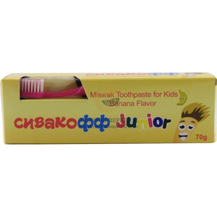 Свойства: регулярное использование пасты с мисваком помогает защитить зубы и десны от кариеса. -Натуральный экстракт мисвака и минералы укрепляют зубы и эффективно защищают от зубного налета -Инновационная отбеливающая формула естественно и мягко отбеливает зубы,придавая им натуральную белизну и сияние. _Аромат банана прекрасно освежает дыхание Руководство: детям младше 6 лет используйте маленькое количество пасты во избежание проглатывания.При использовании фторидных добавок проконсультируйтесь со стоматологом. Хранить в сухом,прохладном,недоступном для детей младше 6 лет месте.В случае проглатывания пасты обратитесь к врачу.