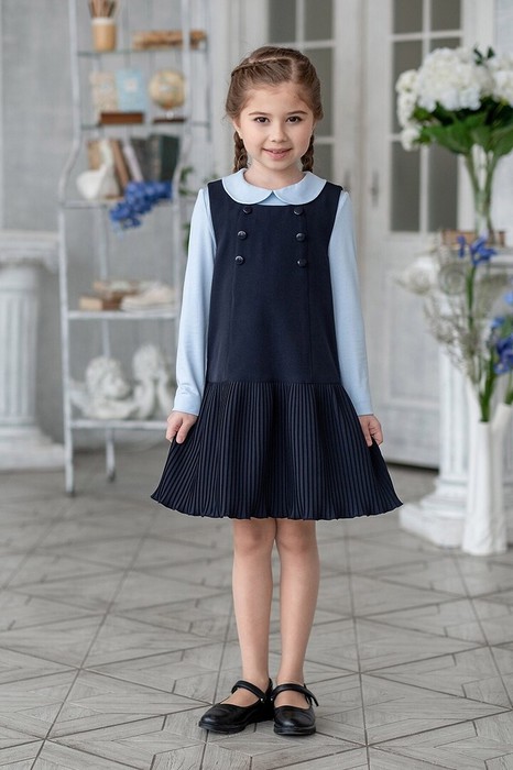 Модель сарафана из однотонной костюмной ткани силуэта трапеции. Нижняя часть сарафана из ткани плиссе. Вырез округлой формы с застёжкой на молнию по среднему шву спинки. Перед сарафана с рельефными швами из горловины. Верхняя часть переда с декоративными пуговицами. Горловина и проймы обработаны внутренними обтачками со стороны изнанки.