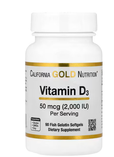 Витамин D3 (50 мкг / 2000 МЕ) от California Gold Nutrition® — это добавка с витамином D в виде холекальциферола в капсулах из рыбьего желатина.
