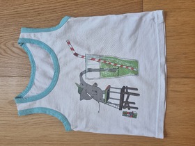 Б/У майка Pelican, популярного российского производителя одежды. Классическая майка из мягкого хлопка, с голубой каймой и принтом, U-образным вырезом. Цвет: Sky. Состав: 100% хлопок. Размер: 1 для мальчика 1 года, ростом 86 см. Состояние: б/у, удовлетворительное (есть пятнышки спереди и малозаметные дырочки).