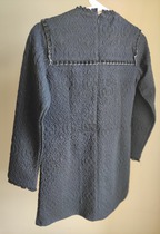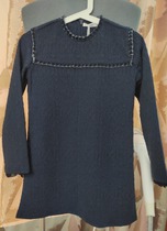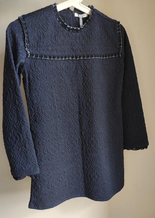 Материал- костюмный трикотаж, держащий форму. Цвет тёмно-синий, с вплетением нити- люрекс. Отделка кокетки, горловины и низа рукавов бархатной лентой. Застежка- молния на спинке.