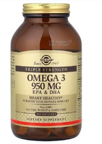 Омега-3 (950 мг) — это добавка с самой высокой концентрацией натуральных полиненасыщенных омега-3 жирных кислот ЭПК и ДГК из холодноводных рыб в продуктах Solgar. Эта добавка помогает поддерживать здоровье сердечно-сосудистой системы, суставов и кожи. Продукт подвергается молекулярной дистилляции для очищения от ртути.