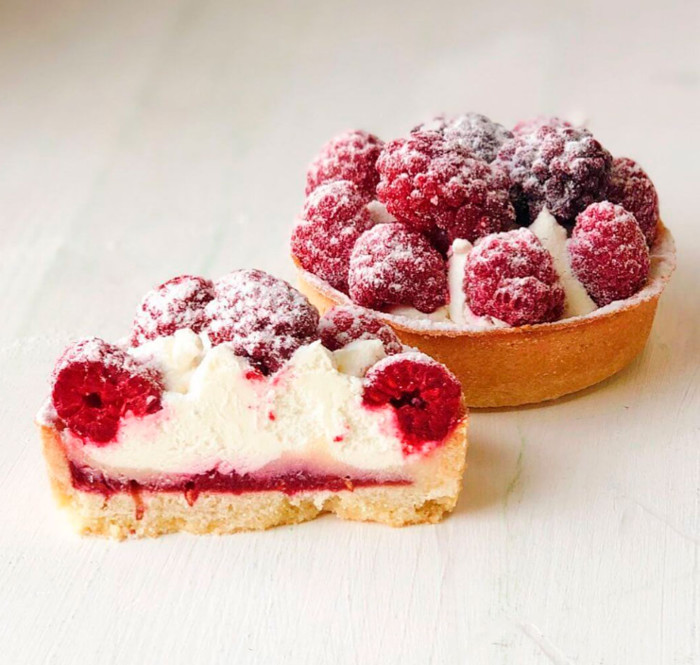 Заварной крем, взбитые сливки и спелая малина в корзиночке из песочного теста.
