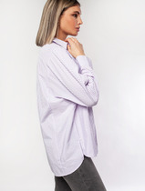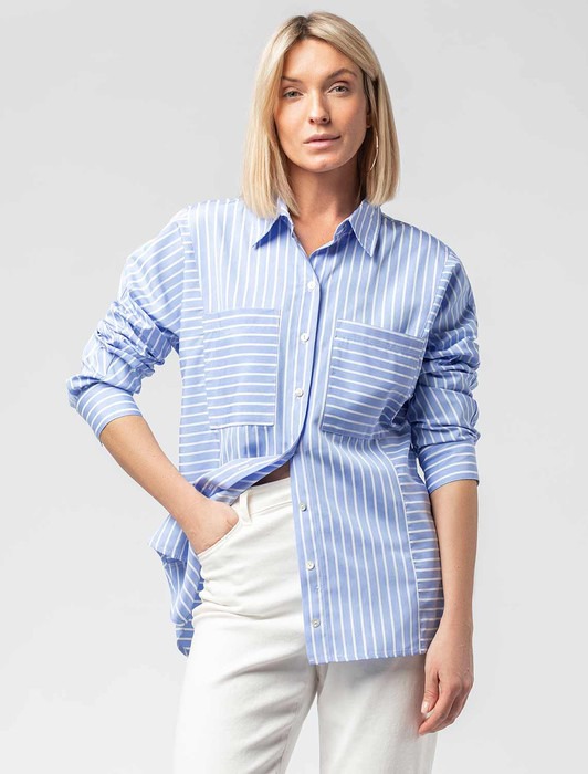 Блузка в полоску с цельнокроеными рукавами летучая мышь. Уникальный крой, где полосы идут в разном направлении, благодаря чему, собран интересный ритм принта. Застежка на пуговицы из натурального перламутра. Свободный силуэт подходит для любого типа фигуры. Совет стилиста: используйте блузку в комплекте с джинсами прямого кроя, чтобы создать городской расслабленный образ. В паре с цветными брюками, на контрасте или в классическом черном сочетании.