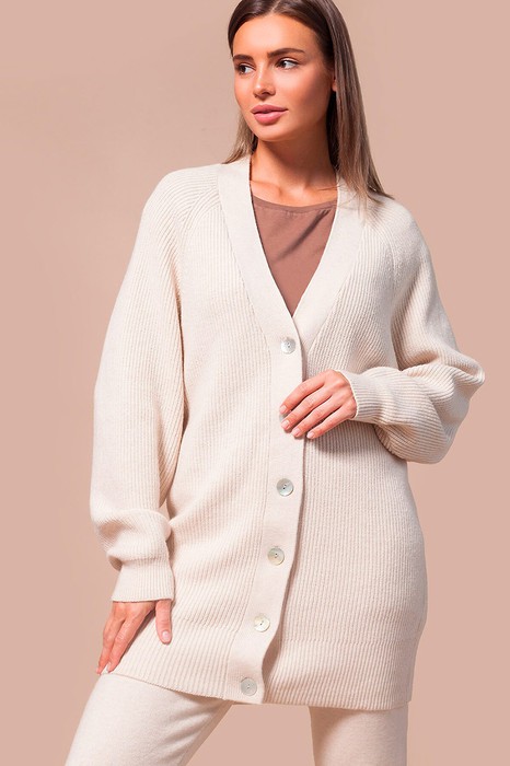 Удлиненный oversize-кардиган. Связан английской резинкой из мягкой и эластичной пряжи с добавлением кашемира. Модель дополнена фигурными перламутровыми пуговицами и объемными рукавами